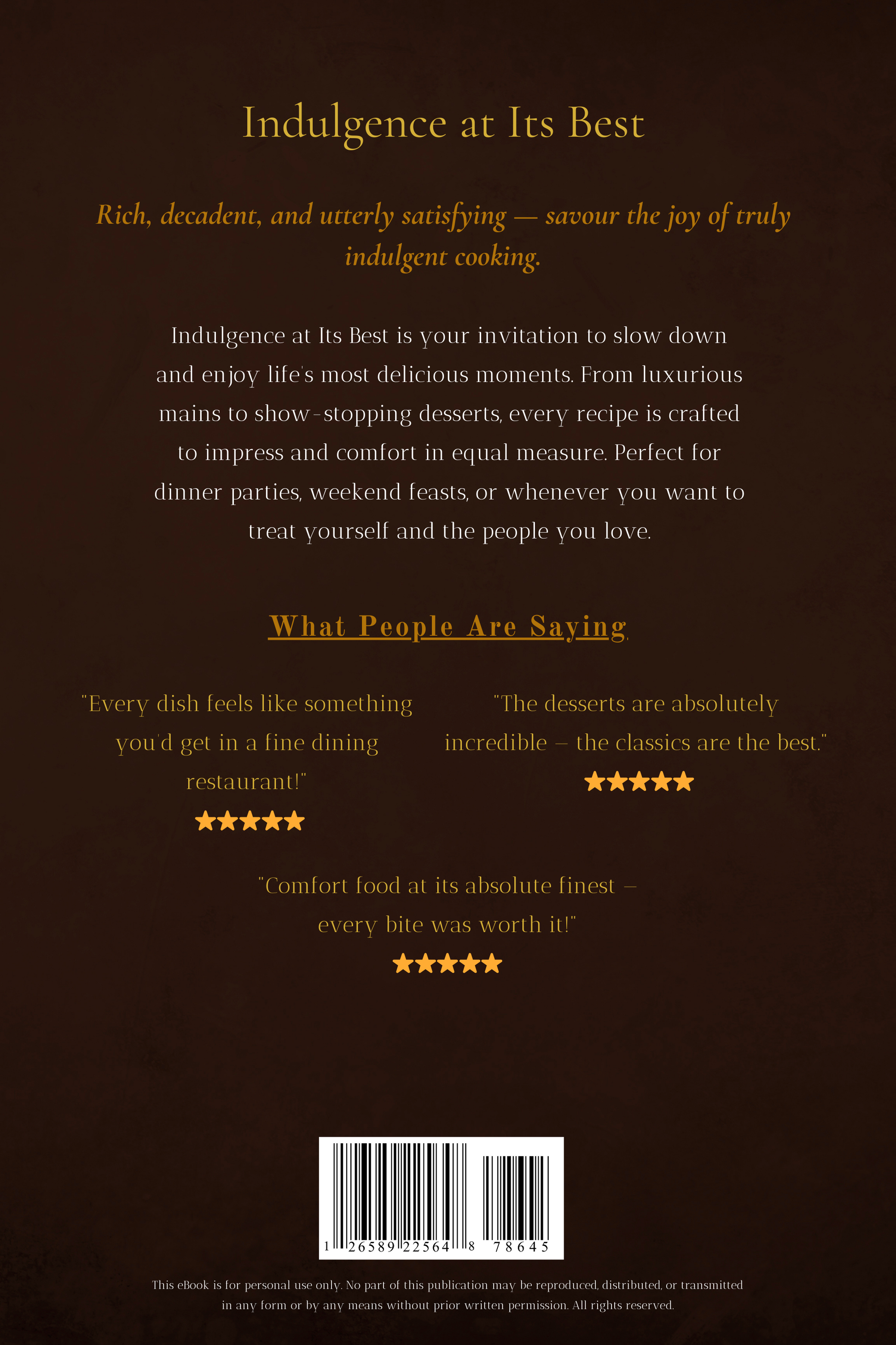 Indulgence at Its Best is a celebration of flavour, comfort, and pure foodie joy. Featuring 30 irresistible recipes — from rich, slow-cooked mains to melt-in-your-mouth desserts — this collection is designed for those moments when only the best will do.